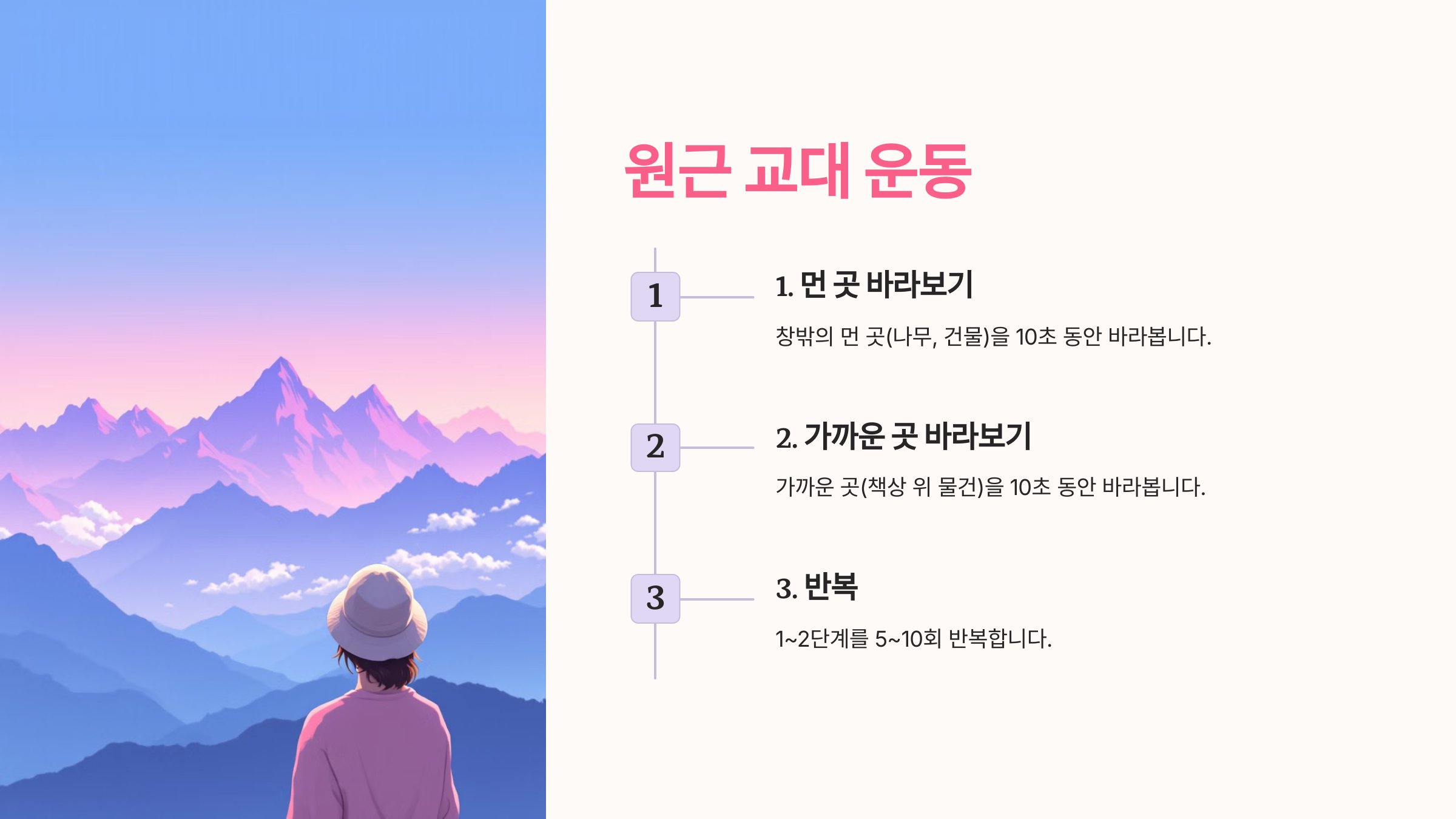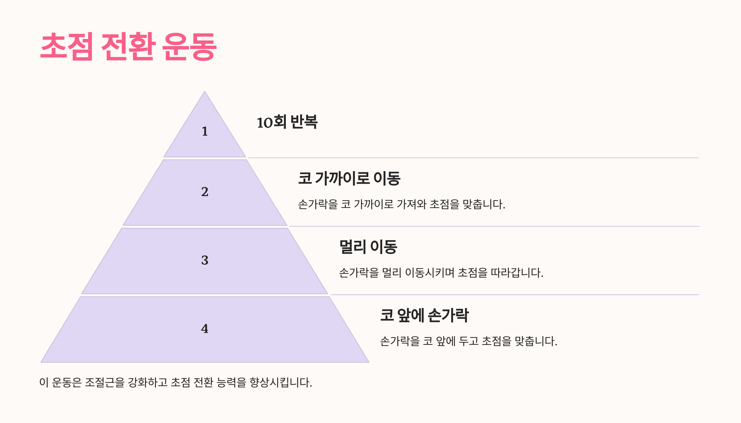 - 효과: 조절근을 강화하고 초점 전환 능력을 향상시킵니다.