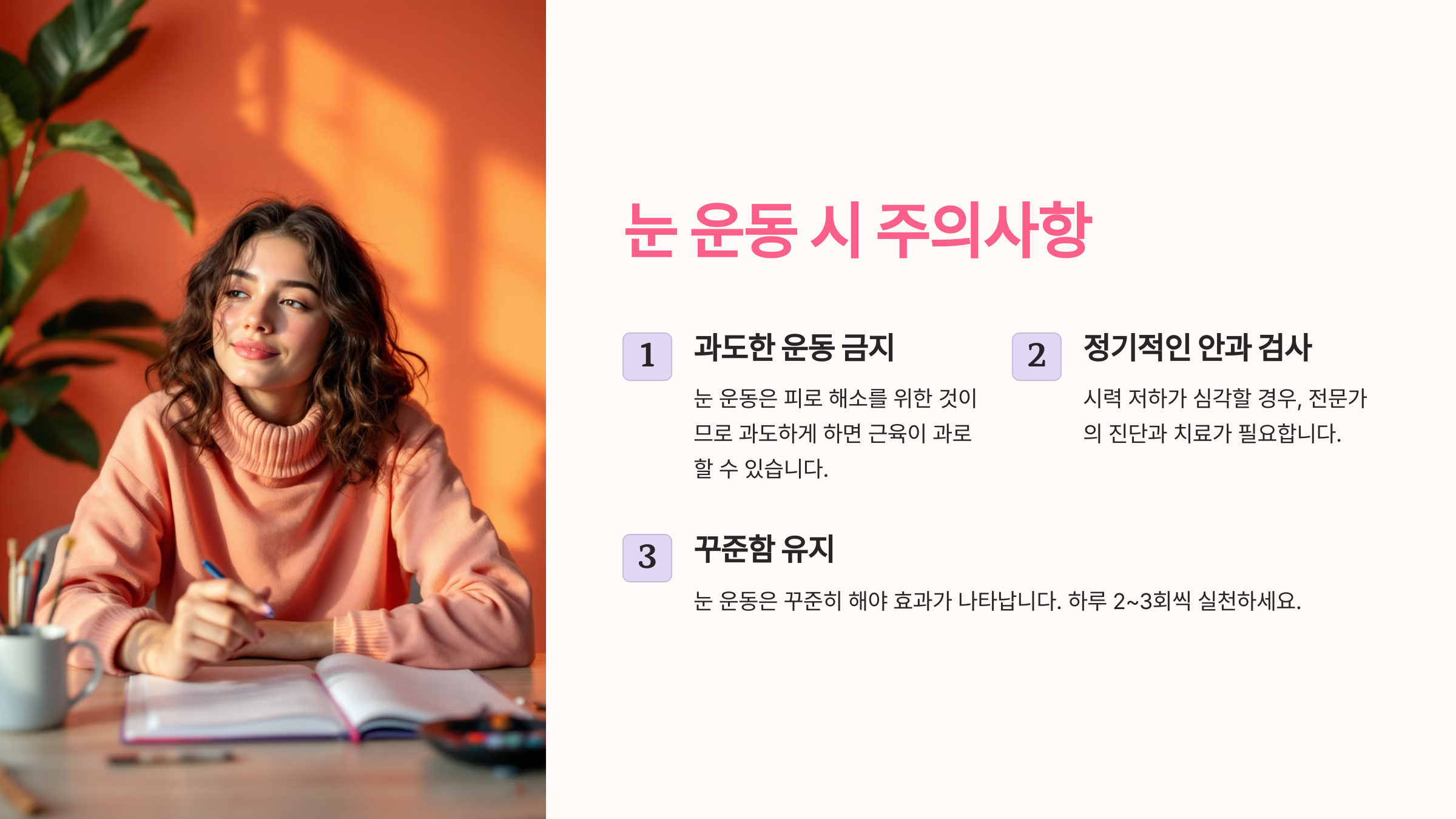 - 눈 운동은 꾸준히 해야 효과가 나타납니다. 하루 2~3회씩 실천하세요.