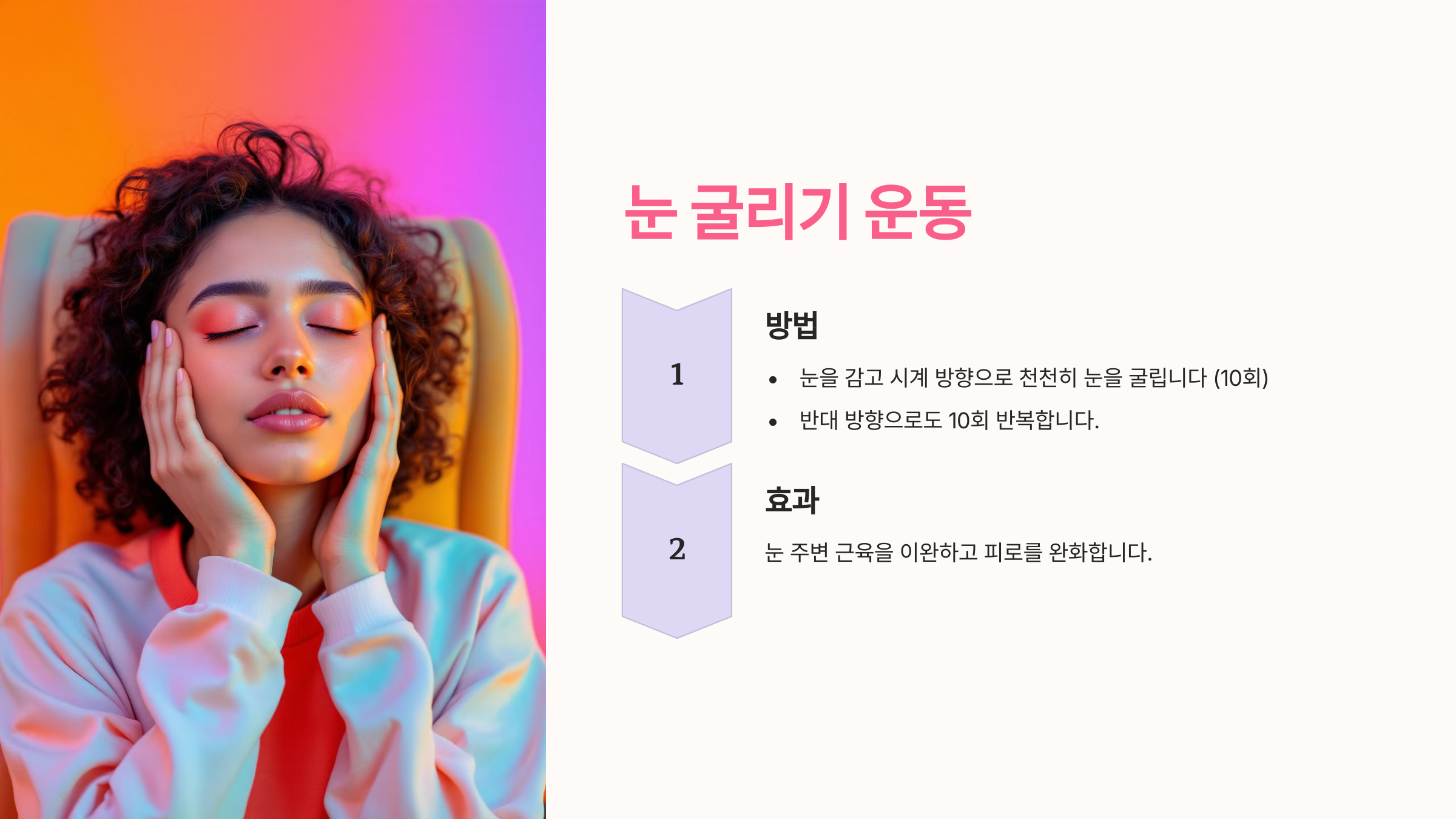 장시간 화면을 보며 긴장된 눈 근육을 풀어주는 데 도움을 줍니다.