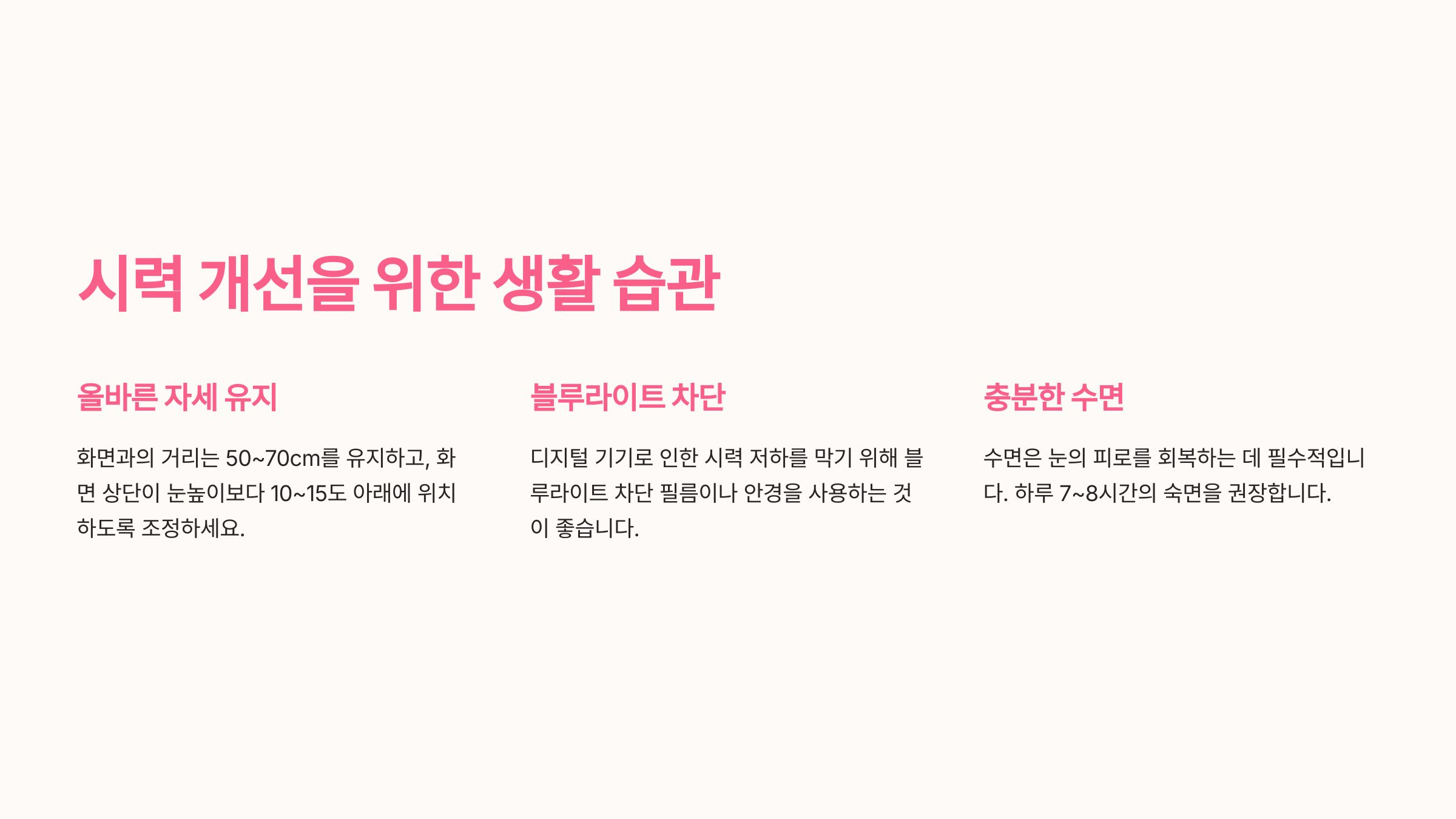 - 수면은 눈의 피로를 회복하는 데 필수적입니다. 하루 7~8시간의 숙면을 권장합니다.