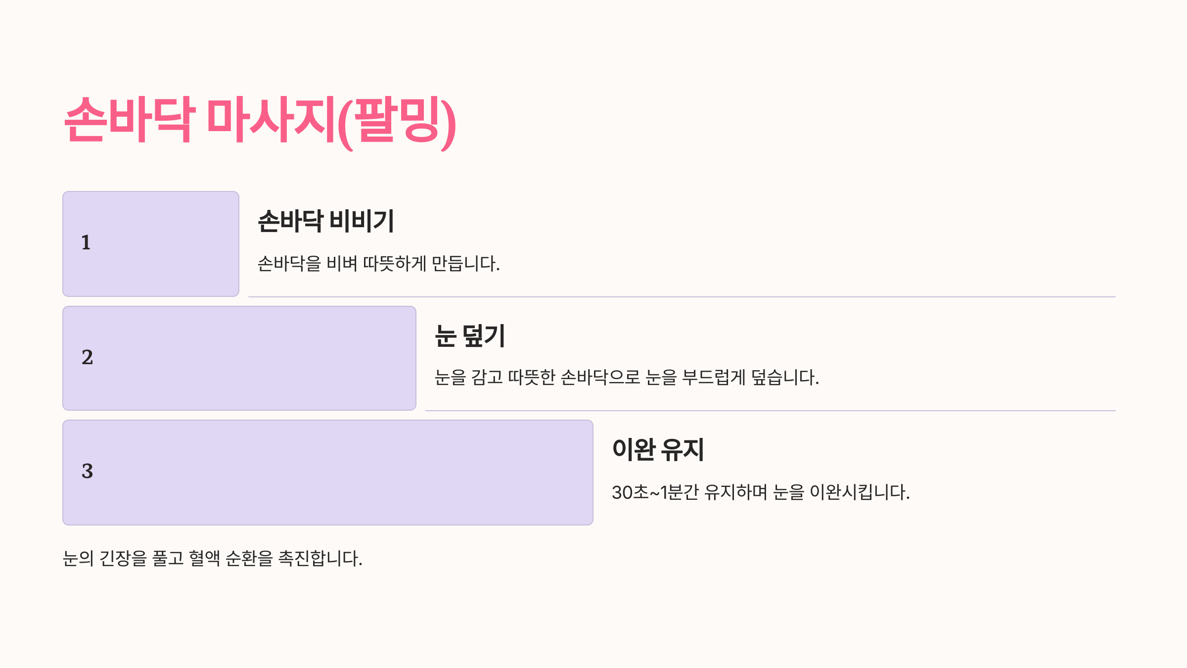 - 효과: 눈 주변 근육을 이완하고 피로를 완화합니다.